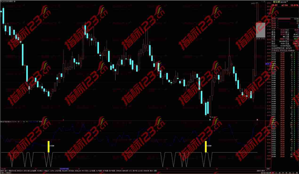 接下来,在股票分析界面上,您将看到新添加的百万级抄底副图指标。它会以图表的形式,清晰地显示出股票的底部信号。当股票价格下跌并出现底部信号时,指标将发出买入提醒,让您轻松把握最佳抄底时机。
