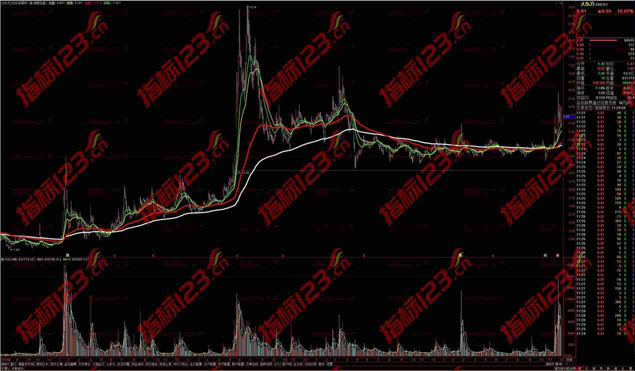 4.实战中虎踞龙盘的虎踞线若开始上穿龙盘线,并且成交量也缓慢放大,同时龙盘线有走平向上迹象,则该股则有可能爆发中线行情,可重点关注。