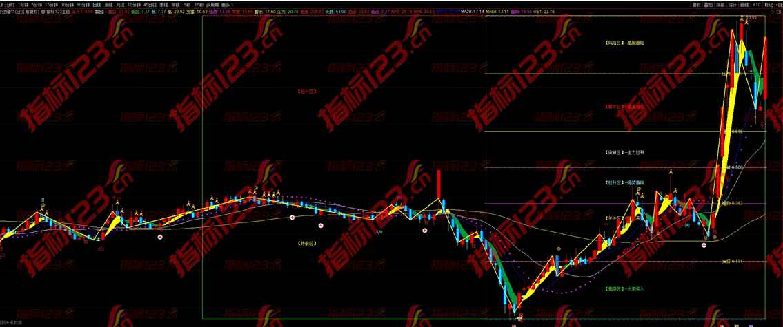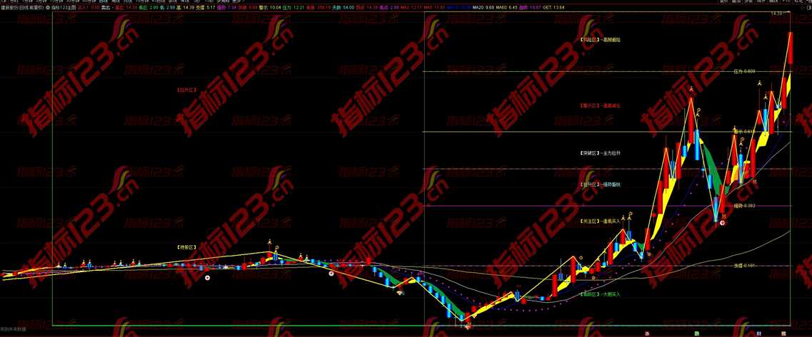 《五区买卖点》主图指标通过独特的五区划分,将市场的波动状态清晰呈现。这五个区域,每一个都代表着市场的不同情绪和状态,从而帮助投资者更好地理解市场,把握市场的脉搏。当指标进入买入区域时,意味着市场正处于一个相对安全的买入区间,投资者可以据此进行买入操作;而当指标进入卖出区域时,则提醒投资者市场即将面临调整,应适时卖出,锁定利润。