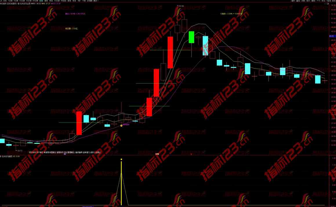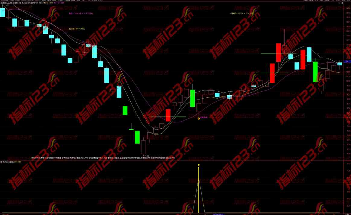 该指标通过精心设计的算法,结合多条均线的组合与回马枪形态的识别,为投资者提供了清晰的市场趋势分析和精准的买入时机判断。在主图中,投资者可以直观地看到均线组合与趋势线的变化,从而把握市场的整体趋势;在副图中,特殊的回马枪形态被精准捕捉,为投资者提供了重要的买入参考点。