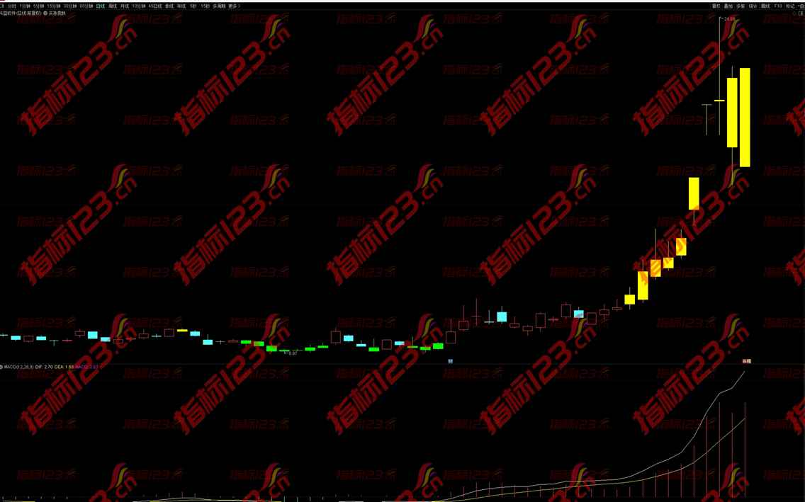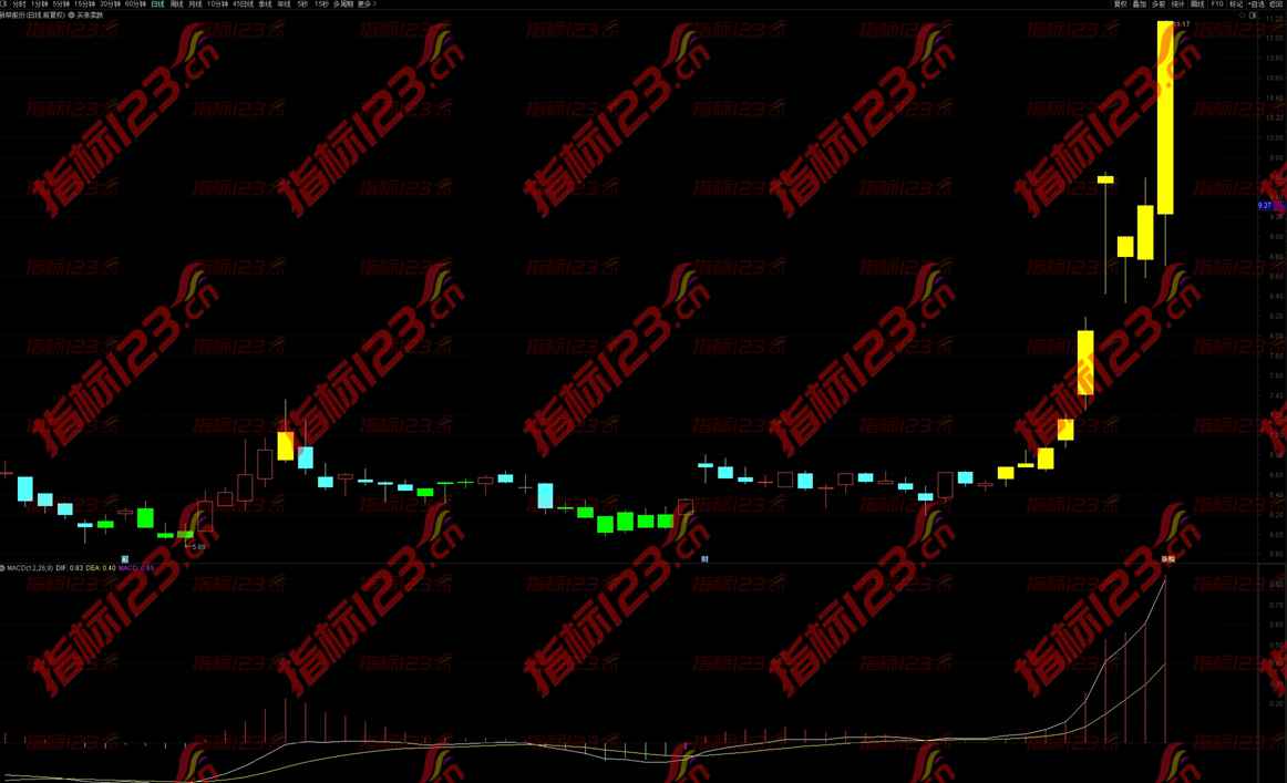 1.入场买点:绿色K线消失收阳,阳线大于5个点以上最佳,买入后以阳线的最低价为止损点,K线变成黄色表示加速拉升,为持股信号;