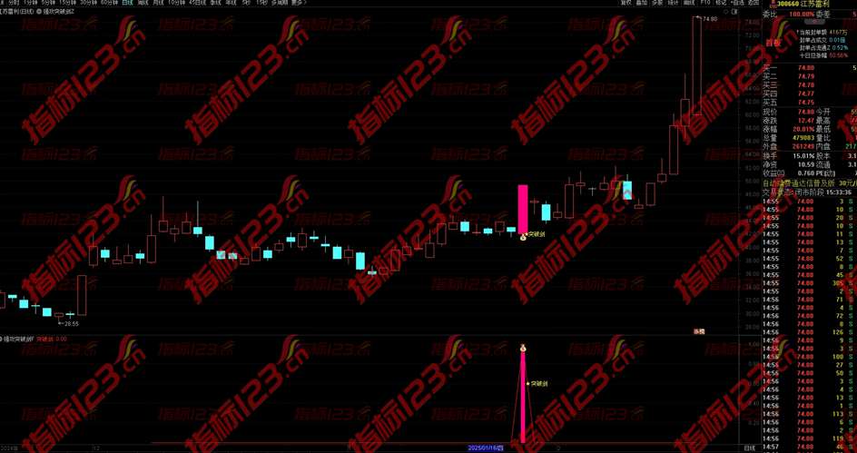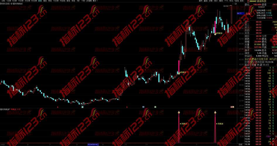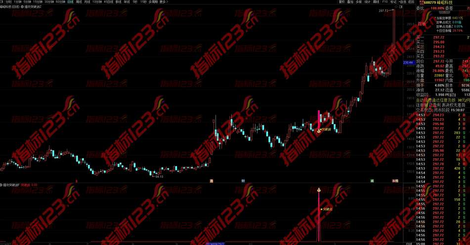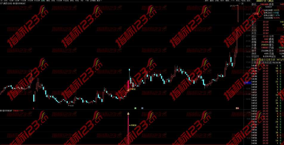 2.通达信《强攻突破剑》指标适用与短线激进者使用,在股价强势突破前期高点的时候第一时间预警,盘中结合分时走势择机入场;