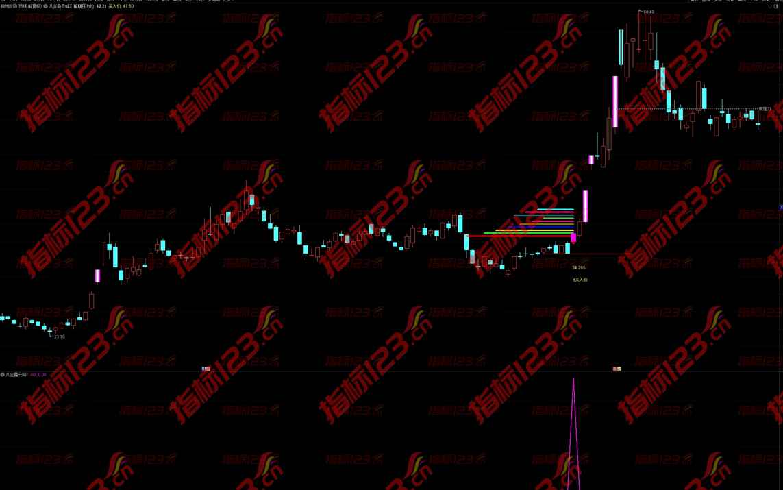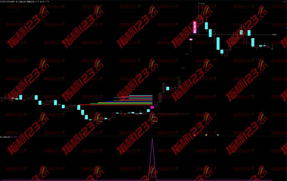 2.通达信《八宝叠云峰》副图用来提示信号进场点和选股预警;