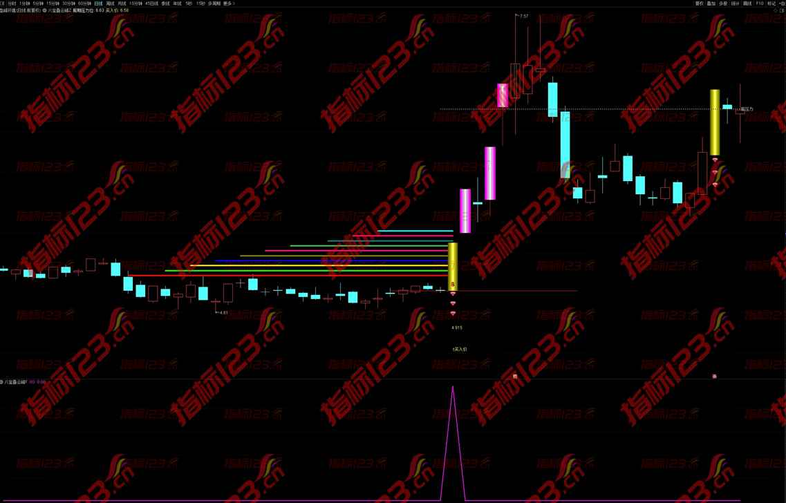 4.买卖信号:通达信《八宝叠云峰》主图出现B点买入信号时,根据当天预警价结合分时走势低吸买入,买入后结合支撑线设置止损价,之后股价不跌跛支撑价可一直持有;