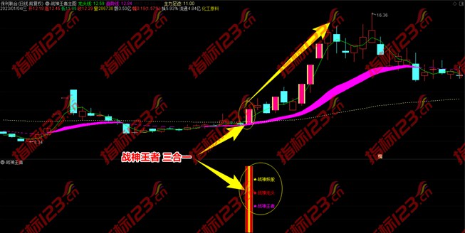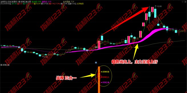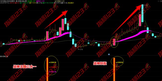 2.战神王者副图指标包含战神妖股、龙头、王者三合一信号和单个信号提示,三合一为共振最强信号;