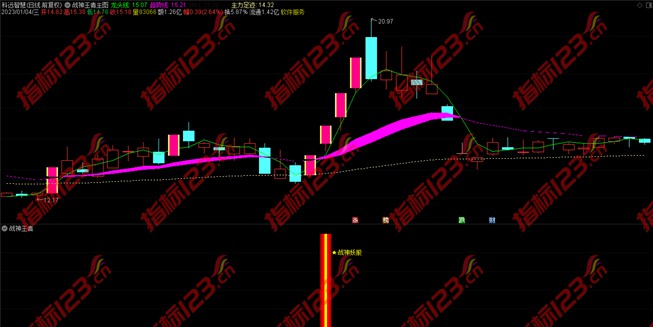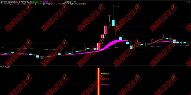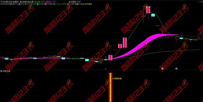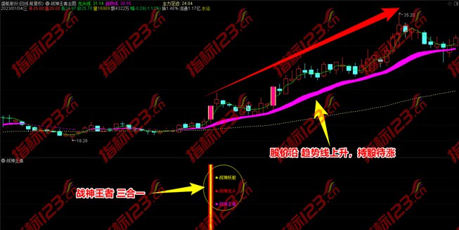4.实战中战神王者主图指标中紫色趋势线拐头向上,线条逐渐变成粗色的紫色带表示个股进入上升趋势,只要股价不跛趋势线就可一路持股待涨;