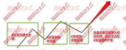 一、通达信ABC主力高控盘趋势模型,(简称“ABC模型”)是专门研究主力“建仓”“加仓”“洗盘”“拉升”这四个阶段的一个模型,“建仓”“加仓”“洗盘”分别对应了ABC三个区域,请看下图: