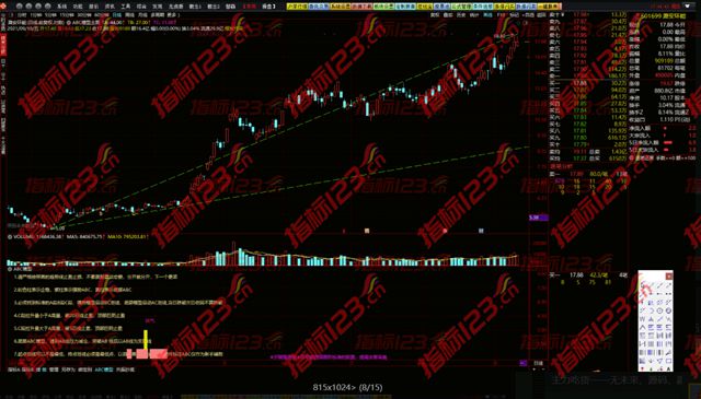 指标分为四个部分:幅图+主图+强势选股+底部选股,可以选股,可以预警,可以做股票池。如图: