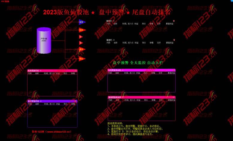 通达信金钻鱼仙2023升级版全套指标公式包含三部分,分别为:鱼窝打分、鱼游打分和鱼仙股池,可实现盘中预警,属盘自动排名功能。本指标先通过鱼窝信号寻找目标个股,然后再通过鱼游信号提示进行下一步操作。