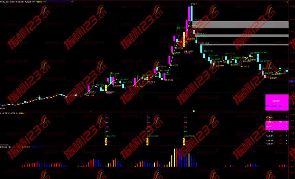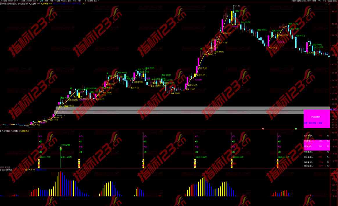 九封至尊全套指标是一种用于识别股票趋势和资金占比的工具,包含了主图指标、副图指标和盘中K线资金显示与资金占比等功能。使用九封至尊全套指标可以帮助投资者更好地了解股票市场的动向,从而做出更明智的投资决策。